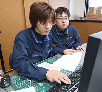 当社の業務課は、海苔製造機械の資材発注及び機械の出荷業務を担当しています。いかにコストを抑えるかを常に念頭に置き、更に製造課と連携し、何千点に及ぶ部品を、遅れず、漏れなく発注しなければならない重要な業務です。